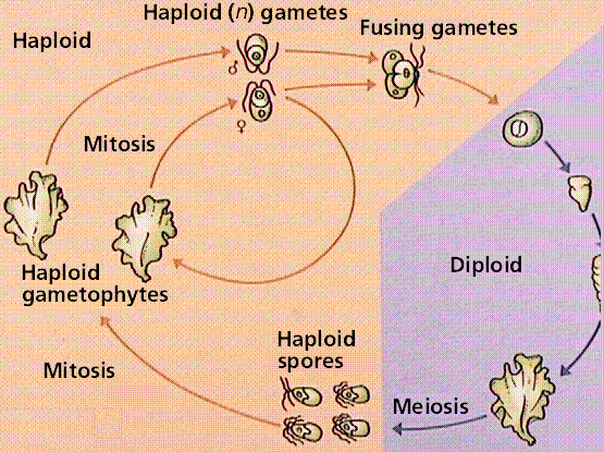 Multicellular green algae have some division of labor, producing various reproductive cells and structures. Ulva, the sea lettuce, exhibits alternation of generations, producing free-living gametophyte and sporophyte forms. The common sea lettuce is usually haploid (the gametophyte) and reproduces asexually. Gametes are produced by mitosis, fuse, and produce a diploid zygote. The 2n zygote germinates and grows to become the sporophyte. Meiosis occurs in certain of the cells in the sporophyte, producing haploid swimming spores that will settle to the ocean floor and produce the next generation haploid gametophyte stage.