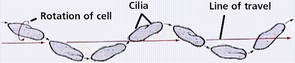 Ciliates travel along a spiral path, with the cell rotating along its long axis and the direction of travel resembling a sine wave.