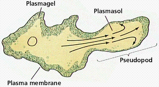 Amoeba and Pelomyxa move by extensions of their cytoplasm known as pseudopodia. Pseudopodia are used by many cells, and are not fixed structures like flagella but rather are associated with actin near the moving edge of the cytoplasm.