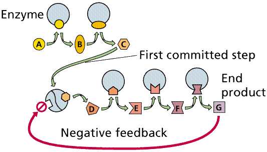 Negative feedback and a metabolic pathway. The production of the end product (G) in sufficient quantity to fill the square feedback slot in the enzyme will turn off this pathway between step C and D. Image from W.H. Freeman and Sinauer Associates, used by permission.