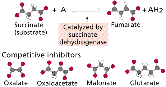 Top: general diagram showing competitor in the active site normally occupied by the natural substrate; Bottom: specific case of succinate dehydrogenase and its natural substrate (succinate) and competitors (oxalate et al.). Images from W.H. Freeman and Sinauer Associates, used by permission.