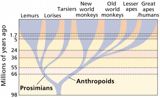 The fossil record indicates primates evolved about approximately 30 million years ago in Africa. One branch of primates evolved into the Old and New World Monkeys, the other into the hominoids (the line of descent common to both apes and man). Fossil hominoids occur in Africa during the Miocene epoch of the Tertiary period. They gave rise to an array of species in response to major climate fluxes in their habitats. However, the nature of those habitats leads to an obscuration of the line that leads to humans (the hominids).