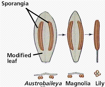 Stamens are thought to represent modified sporophylls (leaves with sporangia on their upper surface). Examinations by James E. Canright in the 1950s suggested an evolutionary series from primitive angiosperms (like Austrobaileya ) which have leafish stamens to others with "normal" stamens (Lilium).