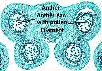 anther  The top of a stamen's filament; divided into pollen sacs in which the pollen grains form. PICTURE 1 | PICTURE 2