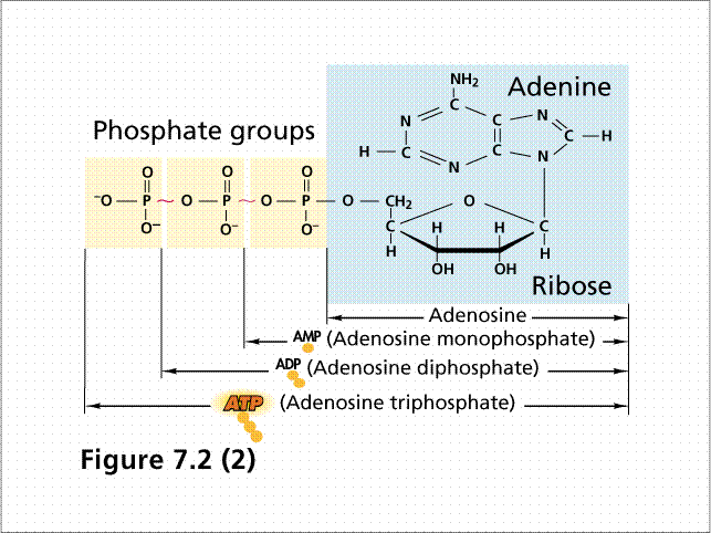 adenosine triphosphate (ATP)  A common form in which energy is stored in living systems; consists of a nucleotide (with ribose sugar) with three phosphate groups. The energy coin of the cell. PICTURE