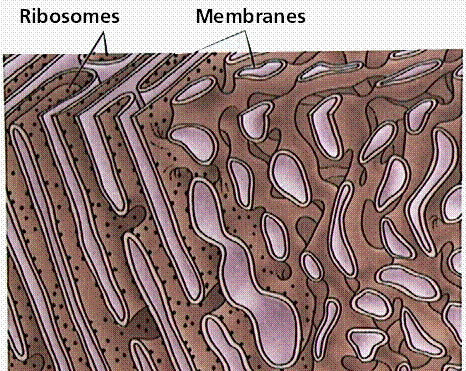 endoplasmic reticulum (ER) A network of membranous tubules in the cytoplasm of a cell; involved in the production of phospholipids, proteins, and other functions. Rough ER is studded with ribosomes; smooth ER is not. PICTURE