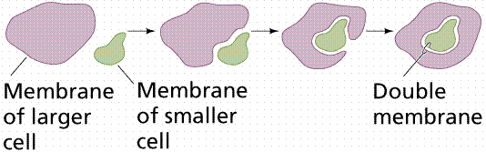 endosymbiosis Theory that attempts to explain the origin of the DNA-containing mitochondria and chloroplasts in early eukaryotes by the engulfing of various types of bacteria that were not digested but became permanent additions to the ancestral "eukaryote". PICTURE
