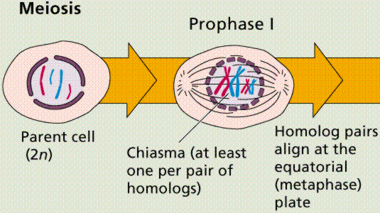 Prophase I has a unique event -- the pairing (by an as yet undiscovered mechanism) of homologous chromosomes. Synapsis is the process of linking of the replicated homologous chromosomes. The resulting chromosome is termed a tetrad, being composed of two chromatids from each chromosome, forming a thick (4-strand) structure. Crossing-over may occur at this point. During crossing-over chromatids break and may be reattached to a different homologous chromosome.